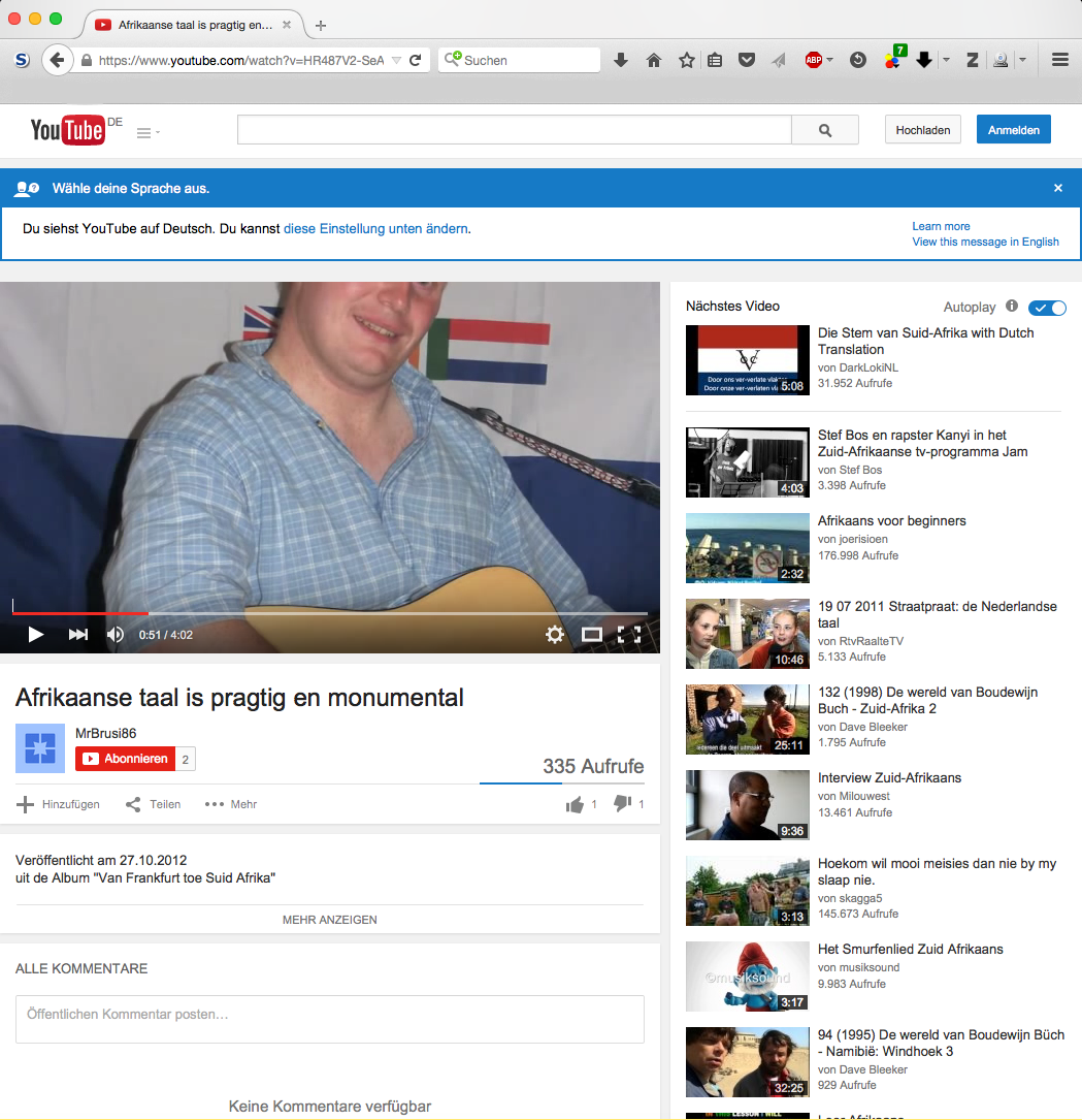 Seine Liebe zum Apartheidsregime Südafrikas drückt er in diesem Video aus. Sein selbsterstelltes Album „Van Frankfurt toe Suid Afrika“ erschien 2012. Im Video ist Brusak vor der alten Fahne Südafrikas zu sehen... (Quelle: youtube.com)