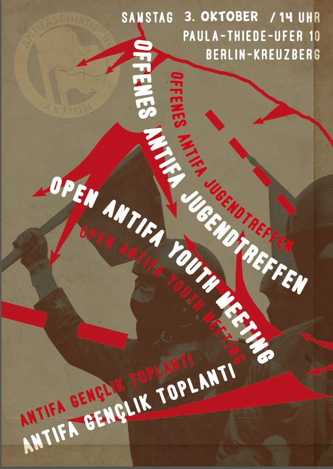 Flyer Vorderseite: Offenes Antifa Jugendtreffen / Open antifa youth meeting / Antifa gençlik toplanti