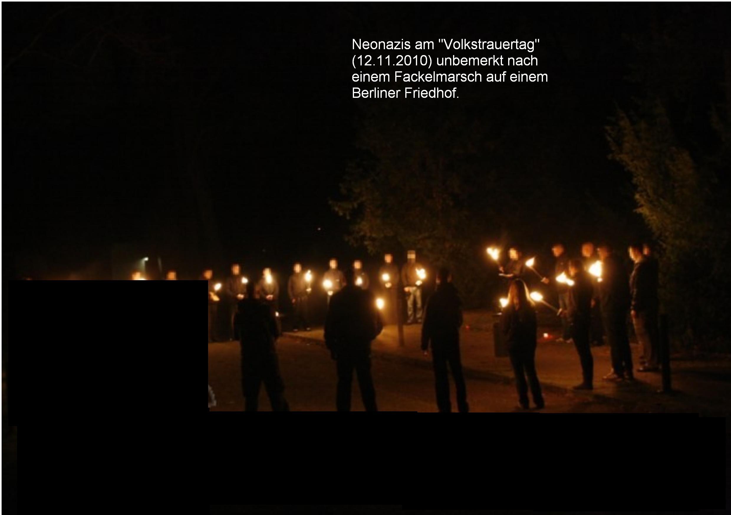 Neonazis am 12.11.2010 bei einem ungestörten Fackelmarsch auf einem Berliner Friedhof.