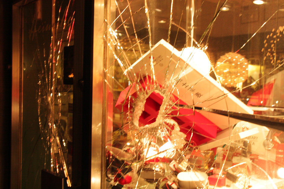 Auf ihrem Weg schlugen die Demonstranten mehrere Scheiben ein.