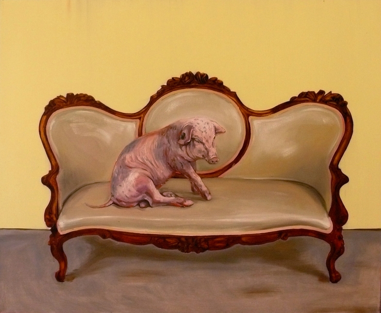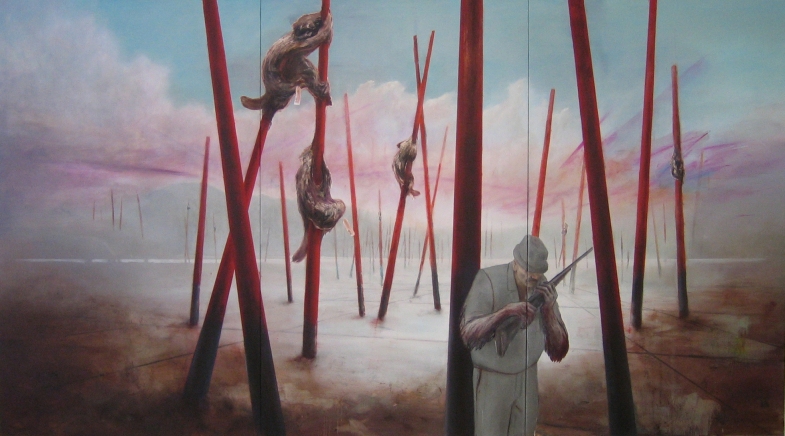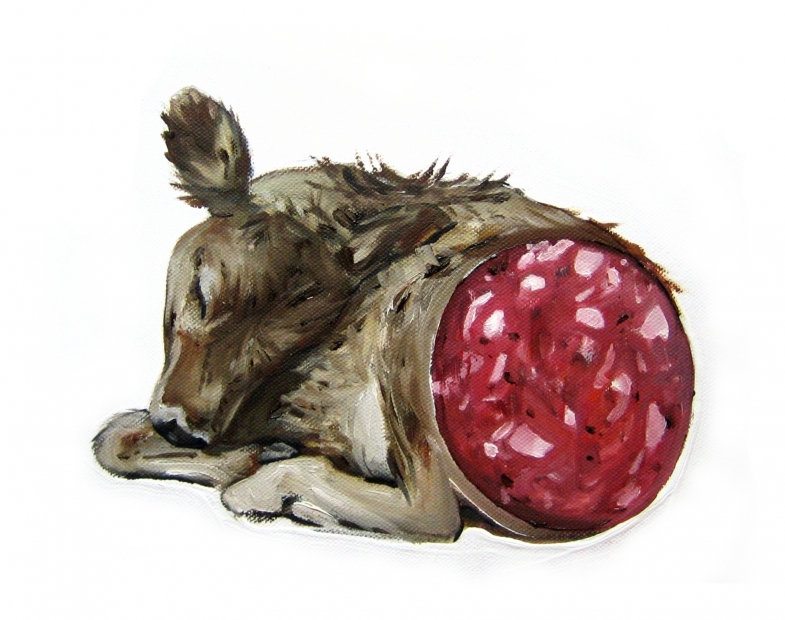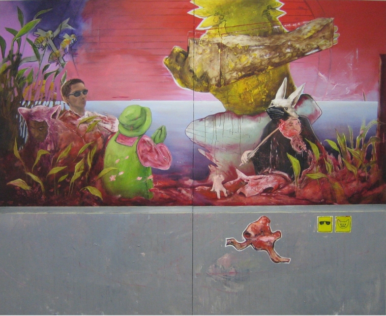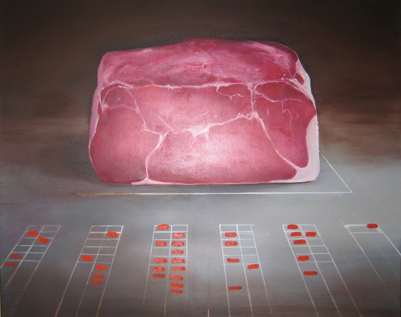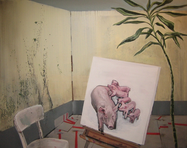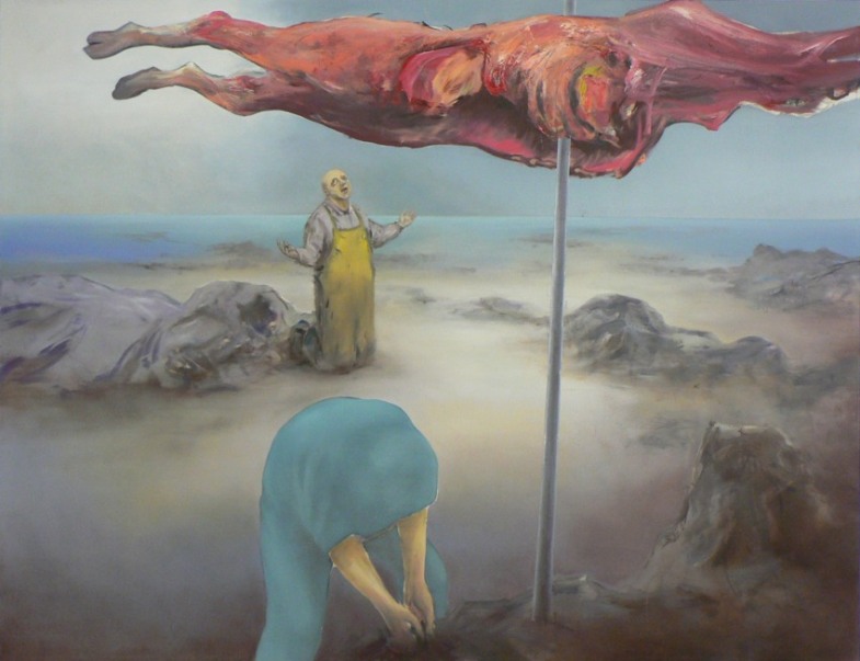 "Ich würde eher von der bildnerischen Auseinandersetzung mit dem Mensch-Tier-Verhältnis aus herrschaftskritischer Perspektive sprechen. Die ersten Bilder zu der Thematik habe ich schon am Anfang meines Kunststudiums 2004 gemalt. Dann habe ich mich vor allem an der menschlichen Figur auf großem Format versucht – der menschliche Körper im Kontrast zu der von ihm geschaffenen Gebrauchsarchitektur war das Grundthema. Als dann 2008 das Diplom näher rückte, wollte ich mein direktes politisches Engagement mit meiner Malerei verbinden. Zum einen hat die künstlerische Reflexion des Mensch-Tier-Verhältnisses eine jahrtausende alte Tradition, so dass ich hier mit malerischen Mitteln gut ansetzen konnte. Zum anderen bewegte mich die Widersprüchlichkeit dieses Verhältnisses schon seit meiner Kindheit. So bin ich wieder zu dem Thema zurückgekehrt und habe mich dann auch intensiv theoretisch damit auseinandergesetzt."