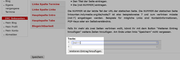 Unter „Linke Spalte Texte“ können statische Texte angegeben werden, die dann im Blog-Menü als verlinkt sind. Analog zu den Headerbildern muss dafür die Node-ID in der Form [nid:NUMMER] eingetragen werden. IMC linksunten beispielsweise möchte im Blog-Menü einen Link zur Kontakt-Seite von linksunten haben und hat deswegen [nid:11] angegeben.