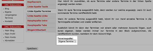 In „Linke Spalte Termine“ ist standardmäßig „Eigene Termine“ ausgewählt, so dass in der linken Spalte des Blogs die eigenen Termine angezeigt und im Blog-Menü Links zu den Archivseiten der vergangenen und kommenden Termine angezeigt werden. Sowohl die Termine als auch die Links zur Archivseite der kommenden Termine tauchen nur auf, wenn es auch Termine des Accounts gibt, die in der Zukunft liegen (analog für die Archivseite der vergangene Termine und Terminen, die in der Vergangenheit liegen).