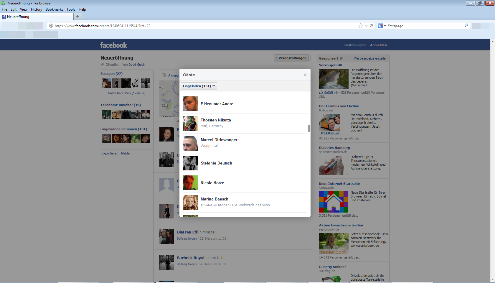 Die Event page wurde schon gelöscht. Auf den Detkil Seiten gibt es aber genug KundInnen, die liken und kommentieren, - die können erreicht werden.