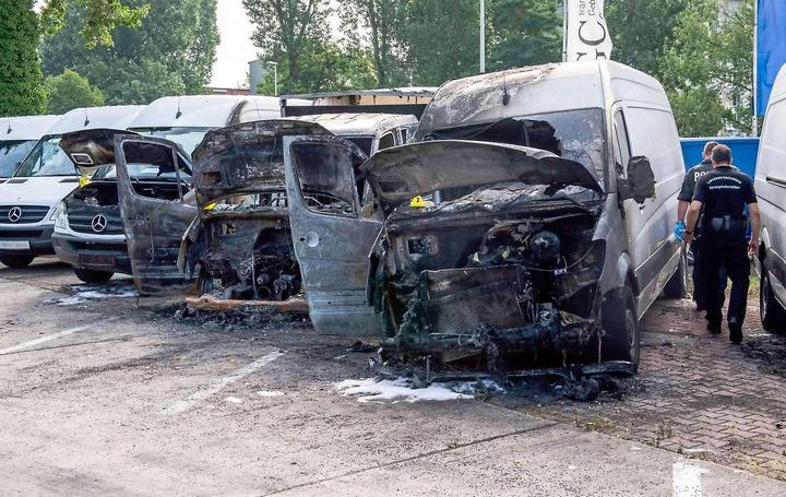 Die Polizei untersucht die ausgebrannten Transporter in Niederschönhausen. Foto: dpa