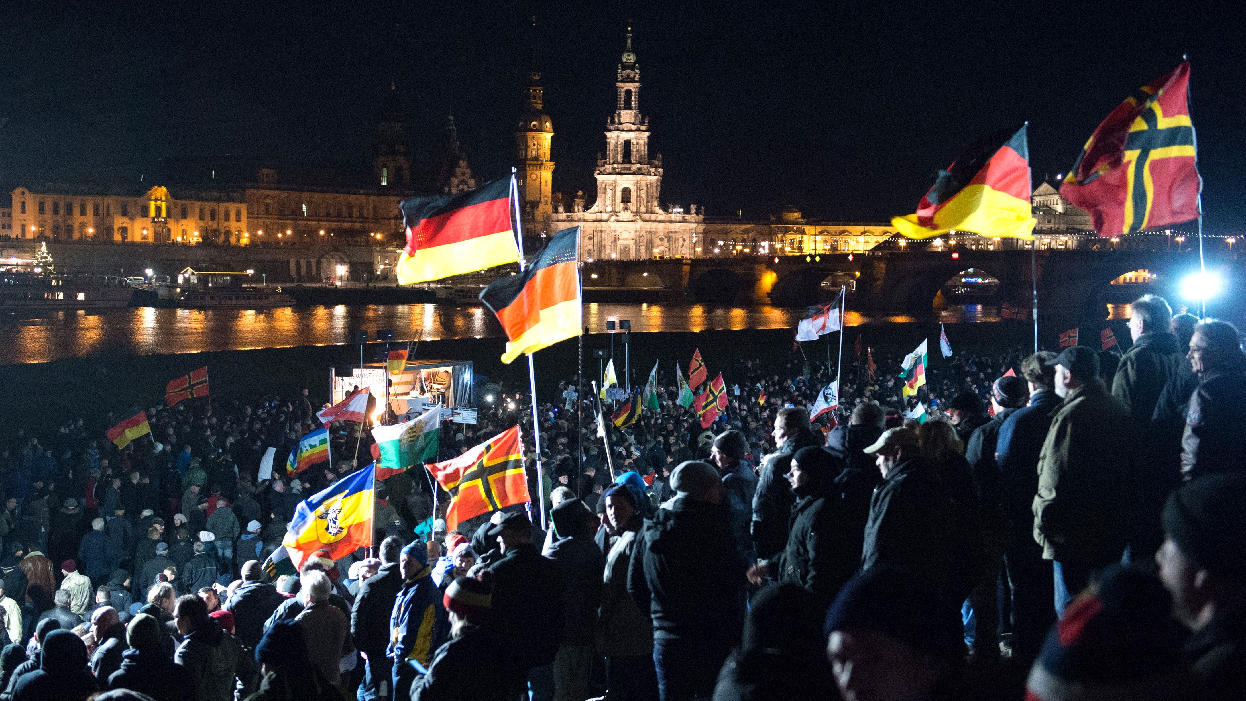 Teilnehmer der Pegida-Kundgebung am Königsufer in Dresden © Sebastian Kahnert/DPA