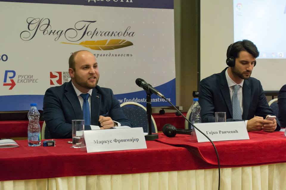 Buchmesse Belgrad, russischer Pavillon. Frohnmaier (li.) und Vladimir Zotov.