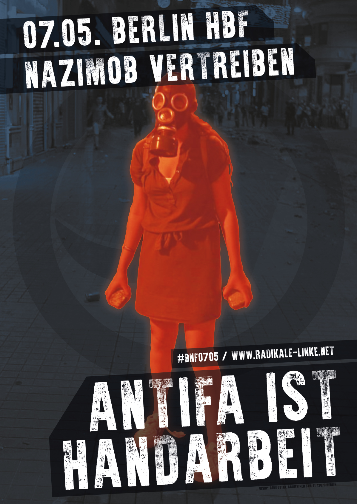 Plakat: Antifa ist Handarbeit - am 7. Mai den Nazimob vertreiben!