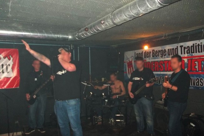 Indulat Konzert – Im Hintergrund: das Transpi der Vorarlberger B&H-Crew, hinter dem sie einige Wochen zuvor mit „Identitären“ posierten