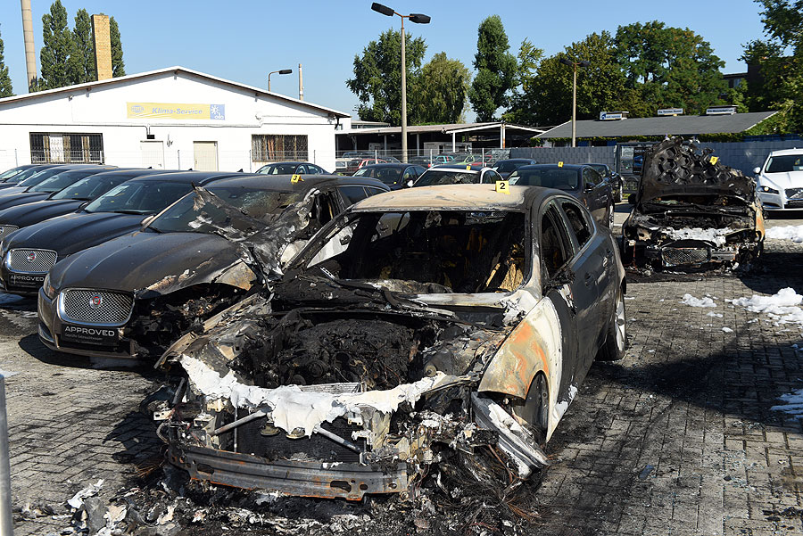 Insgesamt sieben Fahrzeuge sind bei der Brandstiftung in einem Leipziger Jaguar-Autohaus beschädigt worden.