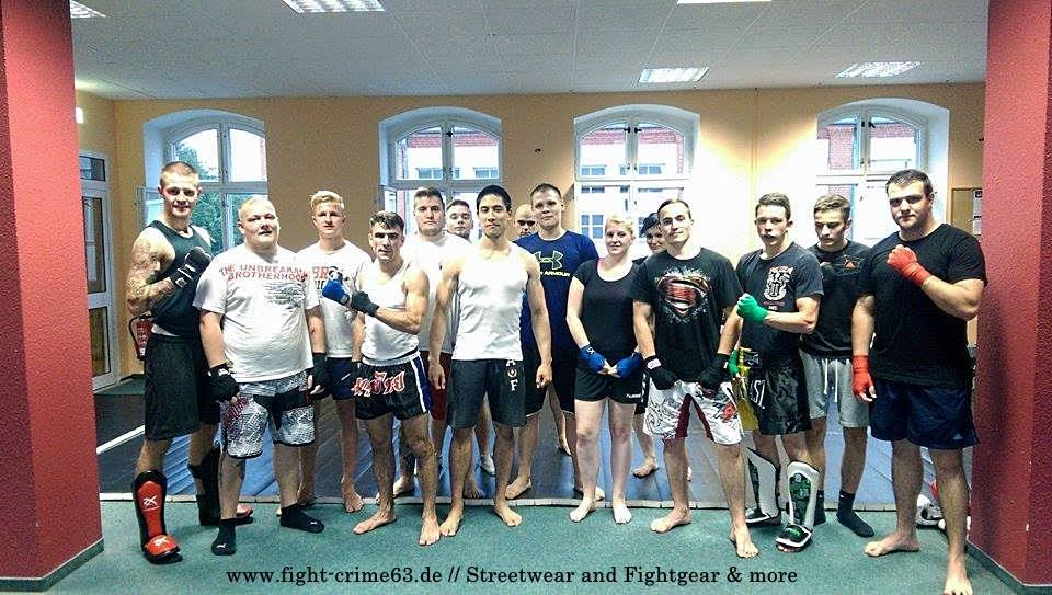 Florian Müller (3.v.r.), Rico Neumann (links), Rick Bochert (2.v.l.), Anton Erhardt (3.v.l.) und Peter Korndörfer (4.v.r.) mit ihrer Kickbox-Trainingsgruppe in der Kampfsportakademie Chemnitz