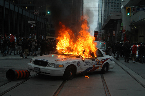 Brennende Karre der Pigs. Haben die Bullen es selbst vorbereitet?