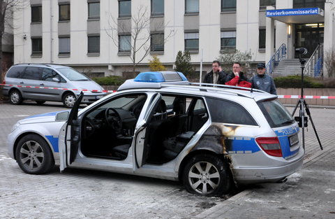 Der durch den Brandanschlag beschädigte Streifenwagen steht vor dem Polizeirevier in Neustadt