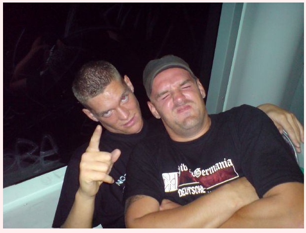 Mario Schober (rechts) mit dem Sänger der Neonaziband "Preussenstolz" Patrick Danz und einem T-Shirt der RechtsRock-Band "Division Germania"
