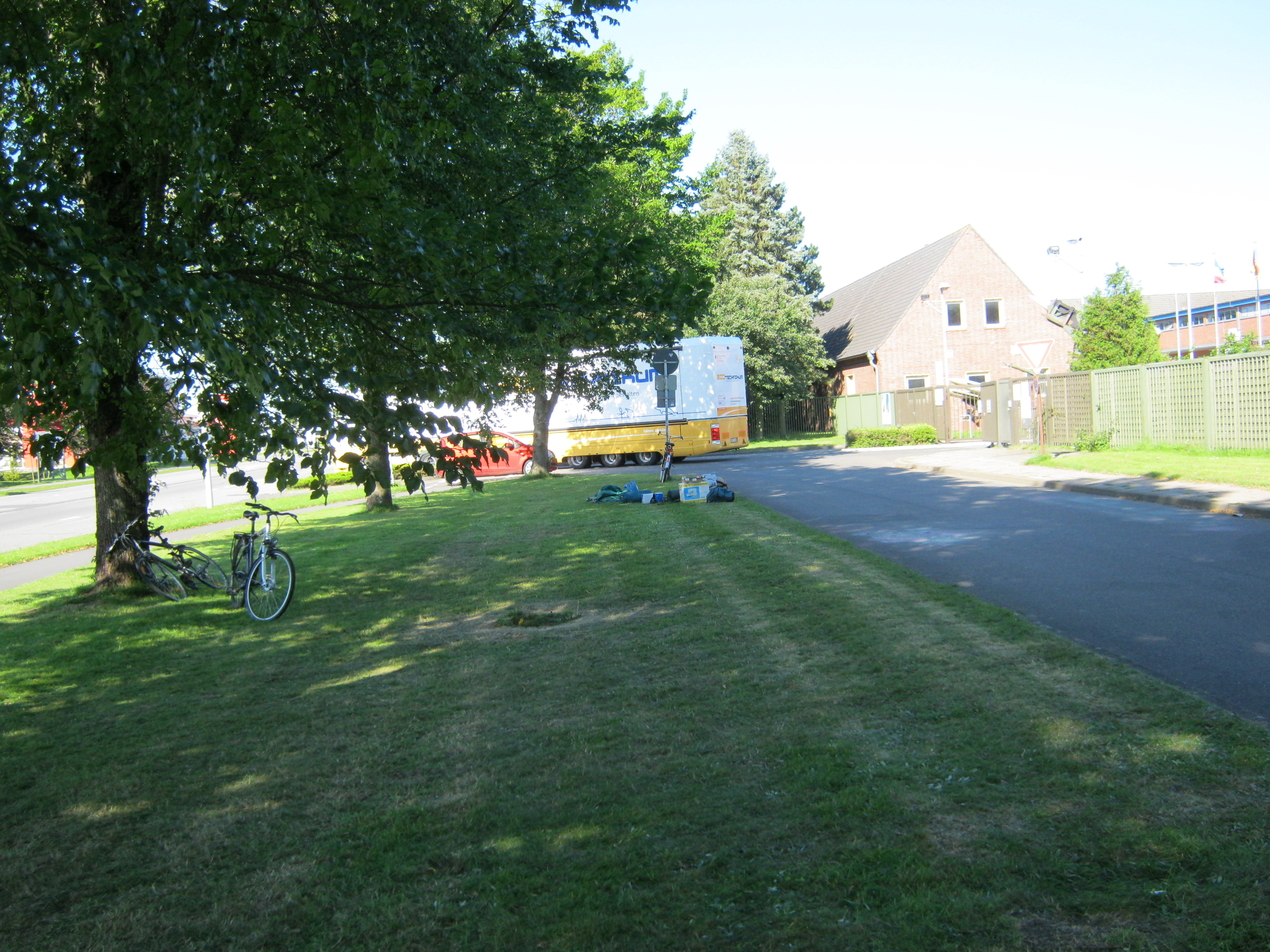 Zivil-Militärische Zusammenarbeit? Ein Werbemobil für Gentechnik parkt Nachts in der Kaserne.